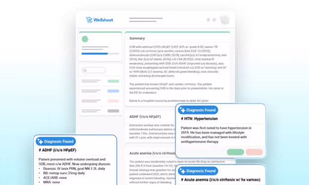 Wellsheet's AI reads the full patient chart and generates documentation in real-time, facilitating a natural workflow for inpatient settings that include multidisciplinary care teams spanning physicians of all specialties to nursing and case management.
